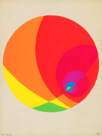 I used 7 hues in #1540, going from a small pale greenish/yellow to yellow, yellow/orange, orange/yellow, orange, red/orange then to red-dark, large. Working from light to dark, the bending slightly bunched together and spreading out with larger steps. In other words acceleration toward the periphery. Still using fluorescent pigments, their strength is still significant to me. I'd hoped for relative equal intensity. No such luck. The orange/yellow is weak and I had to introduce white to raise its value. Too close to the orange, otherwise. Also too red, I had to add yellow. Wherever these pigments are not close enough hue-wise they break too far in intermixing and diminish intensity. Normally, compared to conventional pigments, this orange/yellow would really be high. Here it almost acts like a warm yellow ochre. Spatially, it takes away from the across surface motion. Of course, this is less than desirable, penetrating when least desirable. Still operative though. The painting forces the viewer out of a preconceived path by acting nearly as an eccentric top. I seem to be working on the very act of perceiving. I simply must learn to understand pigment limitations and avoid them. Can't bunch together on the warm yellows.