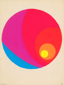 I used 7 hues in #1540, going from a small pale greenish/yellow to yellow, yellow/orange, orange/yellow, orange, red/orange then to red-dark, large. Working from light to dark, the bending slightly bunched together and spreading out with larger steps. In other words acceleration toward the periphery. Still using fluorescent pigments, their strength is still significant to me. I'd hoped for relative equal intensity. No such luck. The orange/yellow is weak and I had to introduce white to raise its value. Too close to the orange, otherwise. Also too red, I had to add yellow. Wherever these pigments are not close enough hue-wise they break too far in intermixing and diminish intensity. Normally, compared to conventional pigments, this orange/yellow would really be high. Here it almost acts like a warm yellow ochre. Spatially, it takes away from the across surface motion. Of course, this is less than desirable, penetrating when least desirable. Still operative though. The painting forces the viewer out of a preconceived path by acting nearly as an eccentric top. I seem to be working on the very act of perceiving. I simply must learn to understand pigment limitations and avoid them. Can't bunch together on the warm yellows.