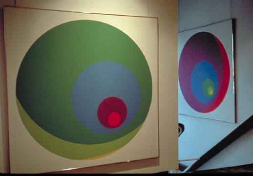 The method used in executing the exhibited works is sequential serialization. The internal figure is in itself serialized within each canvas, then continued from painting to painting. Color is programmed in a continuous internal manner and as chain-link progression from canvas to canvas. Very little local alteration is done when full programming has been realized, meaning all entities are locked in. The paintings, hung in sequential order, reveal the underlying color program. The entire sequence of paintings is considered the total unit, though each individual component painting should nevertheless be seen as a complete entity in itself. While this represents the overall strategy, the internal events and speculations, different from one to the next should not be overlooked.